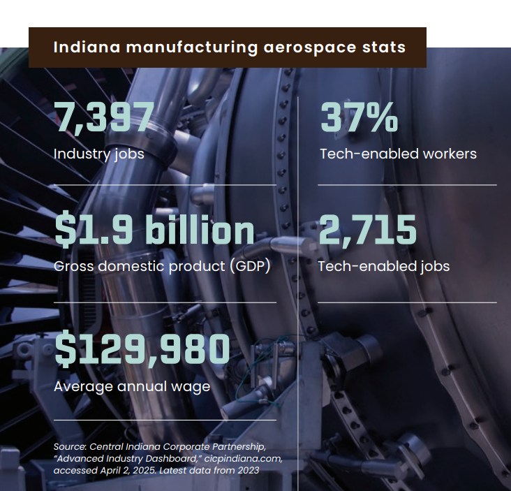 According to Conexus Indiana’s latest study, Future Ready: Advancing Indiana’s Productivity through Critical Manufacturing Subsectors, the aerospace manufacturing sector stands out with the highest share of tech-enabled roles—37% of its workforce—far exceeding the statewide manufacturing average of just 8%. These roles are essential to powering digital aviation systems, advanced propulsion technologies and smart manufacturing operations.