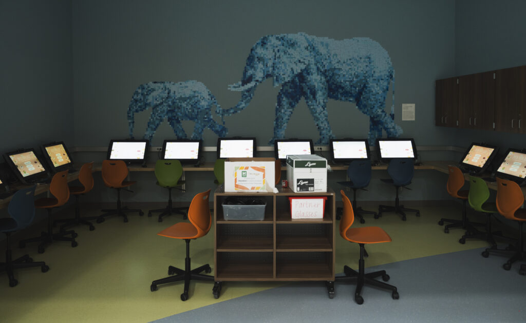Today the former natatorium is a bright and open space inviting Plainfield Community School Corporation’s 2,500 elementary school students to dive in to hands-on learning experiences. Each child makes a 90-minute visit – or “Odyssey – to the Lab with their class nine times in the course of the school year. Once in the space, the kids split into groups that rotate through the Lab for a series of activities that employ both hands-on projects and digital experiences.