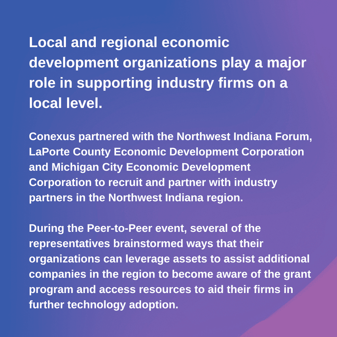 Ultimately, we hope these conversations will drive greater adoption of advanced technologies by allowing a variety of stakeholders to learn about technology among engaged and informed peers. Reach out to Conexus Indiana to get involved.