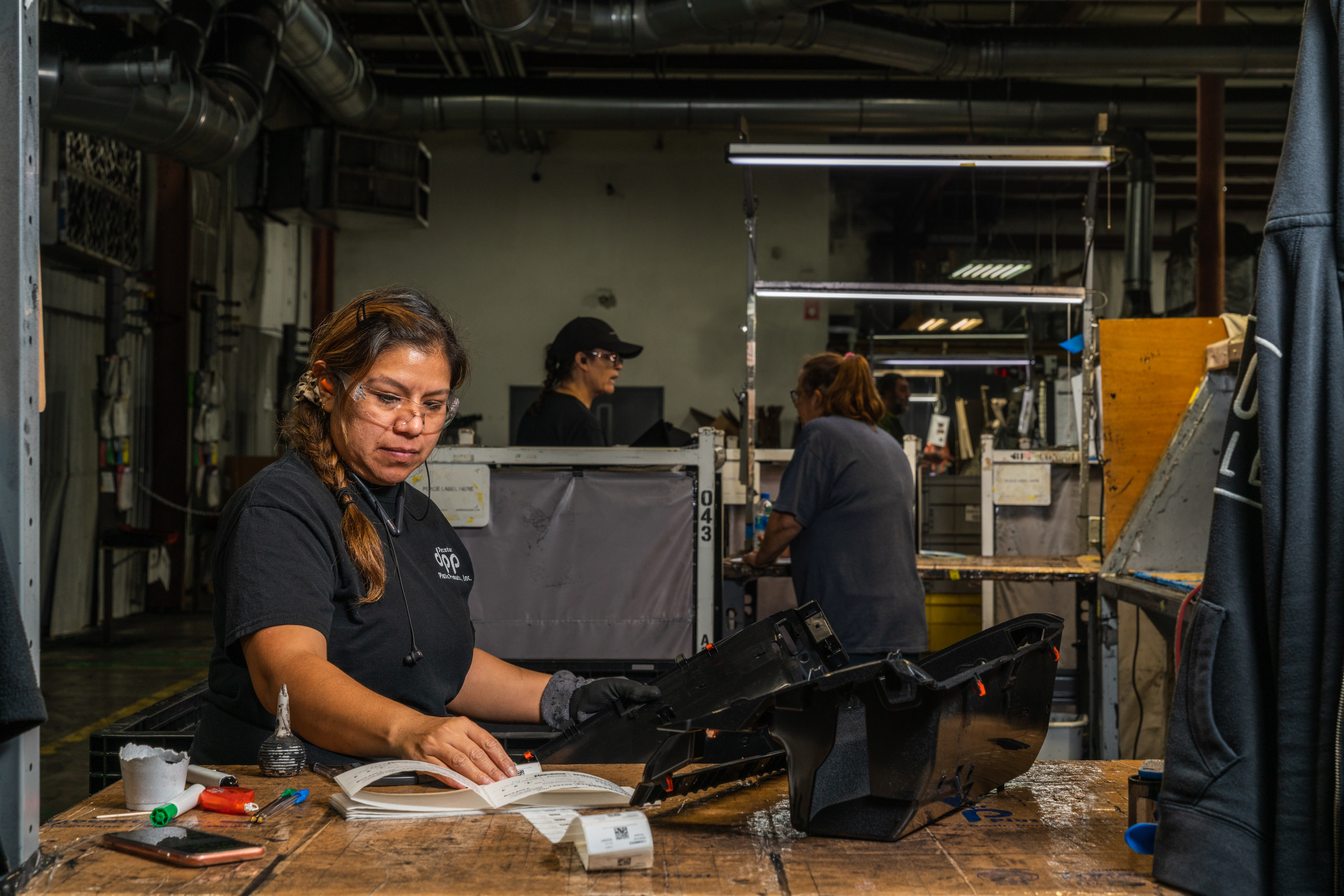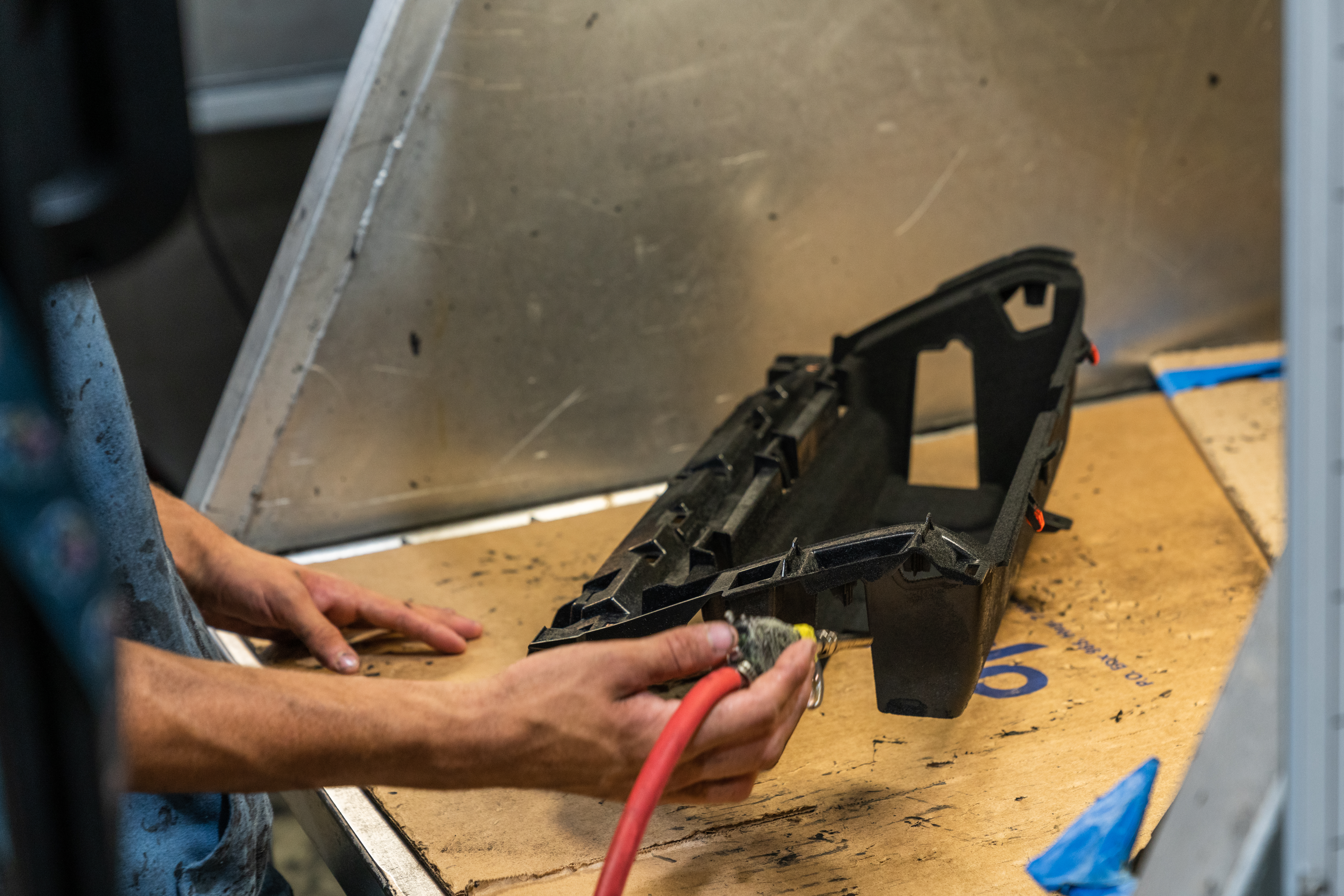 At Decatur, the process entails spraying the flock strands with an electric charge that helps them stand up. To make them even fluffier, the part is then placed in an oven at 150 to 180 degrees for 15 to 17 minutes. Finally, the part is inspected, any residue is blown off, and then it is packed for shipment.