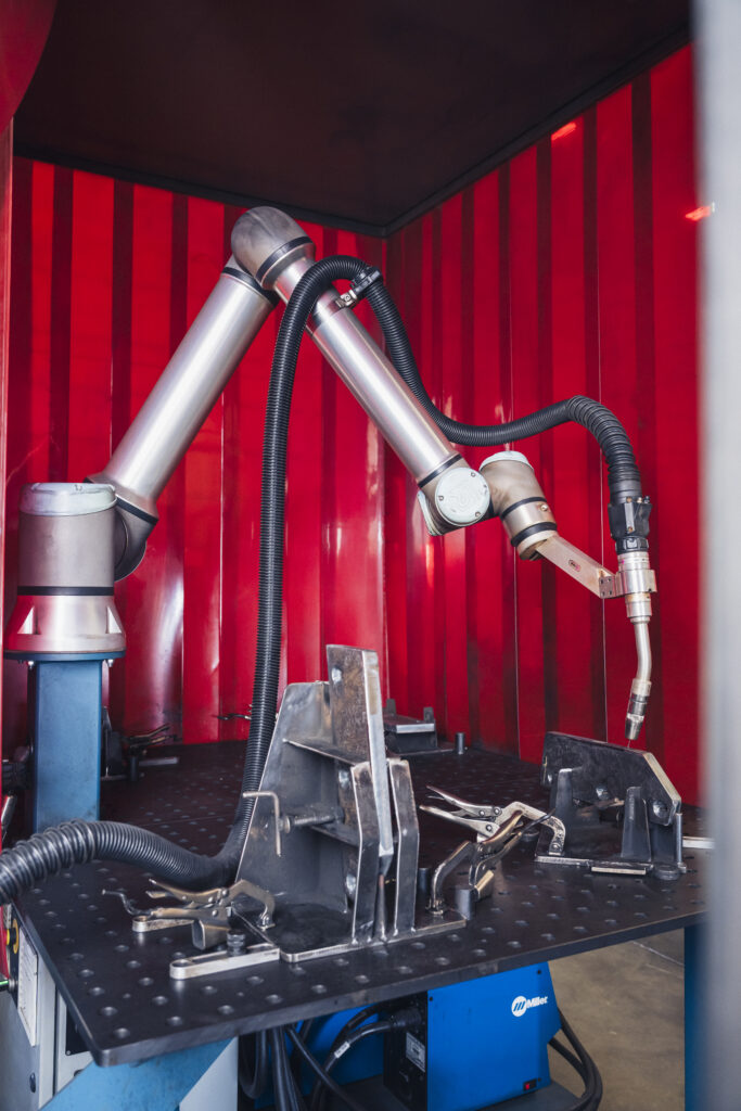 “Cobots are expensive,” he echoed. “They’re for automotive. They’re for John Deere and Case and tractor factories.” But a cobot’s lower financial barrier to entry and relatively simple training process began to open his eyes to their compatibility with a more specialized manufacturing environment like Hurricane. “When skills and experience are scarce… when training someone to work alongside the cobot to make sure it doesn’t malfunction, to know what buttons to push – this can eliminate the need for employees who are in a rapidly disappearing specialty like welding. Existing workers can train to collaborate with that robot, essentially doing a job that fewer and fewer people can do.”