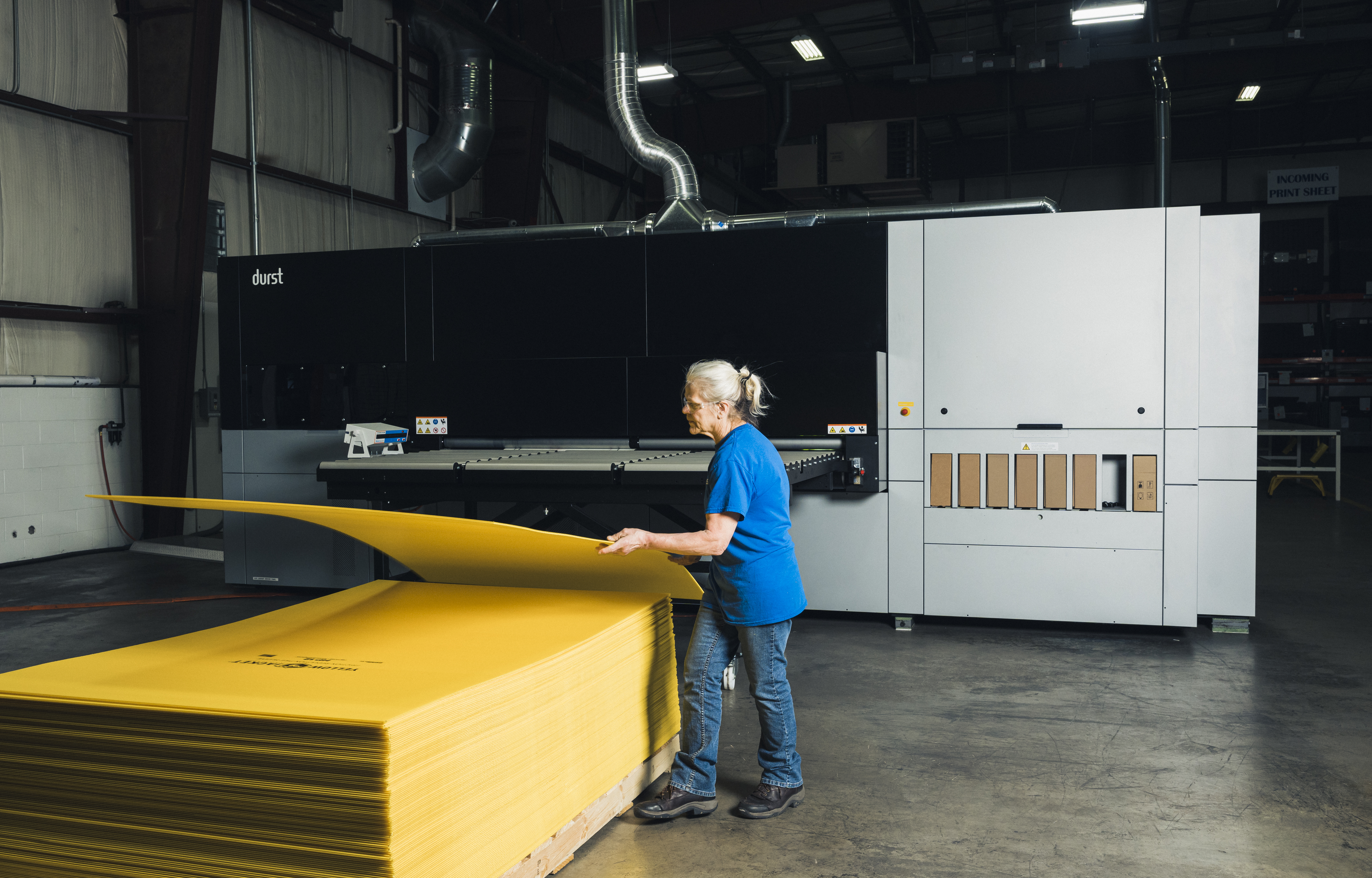 Combined with robotic feeding capabilities for plastic materials to the CAD table, the new advanced digital printer has significantly increased production at the Richmond plant. “Our fabrication group can run anywhere from 100 to 120 SKUs a month,” Doug said, “and about two or three of them repeat next month, so it’s a very custom-oriented shop.” To explain the impact of those numbers, he said a single SKU can include nine different pieces, with a production run of anywhere from 50 to 10,000 for a major, big-box retail customer. The new robotic feeder takes on that repetitive task so employees can focus on the human jobs that enable the plant to maintain and increase that capacity.